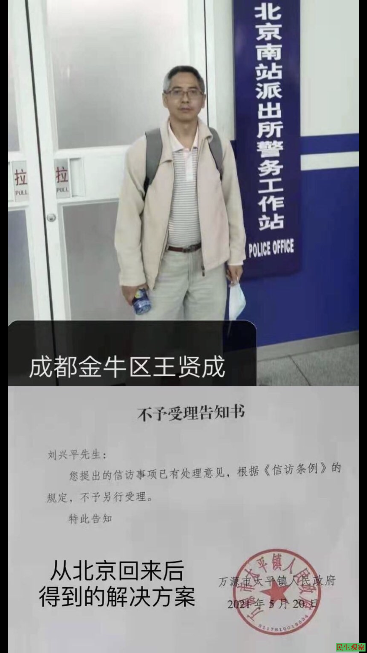 发生在5月20日的是成都金牛区上访冤民王贤成,在北京通过网络上传出在北京南站派出所警务室的工作照,晚上十点左右打来一个短暂的求救电话,此后一直处于关机状态。北京、成都、重庆的上访难友,通过手机向北京110警察拨打查询电话,北京警察告知:下落不明。上访难友再询问四川驻京办事处,回答的结果也是不在此地。此后两天都没有报平安和明确状态的具体消息。关注和关心王贤成的上访难友们分析认为:一定是被成都有关部门派人追踪到北京,将他秘密截访控制在某个地方。至于如何处理现在还不能预测。可以肯定的是目前境况不会很好。