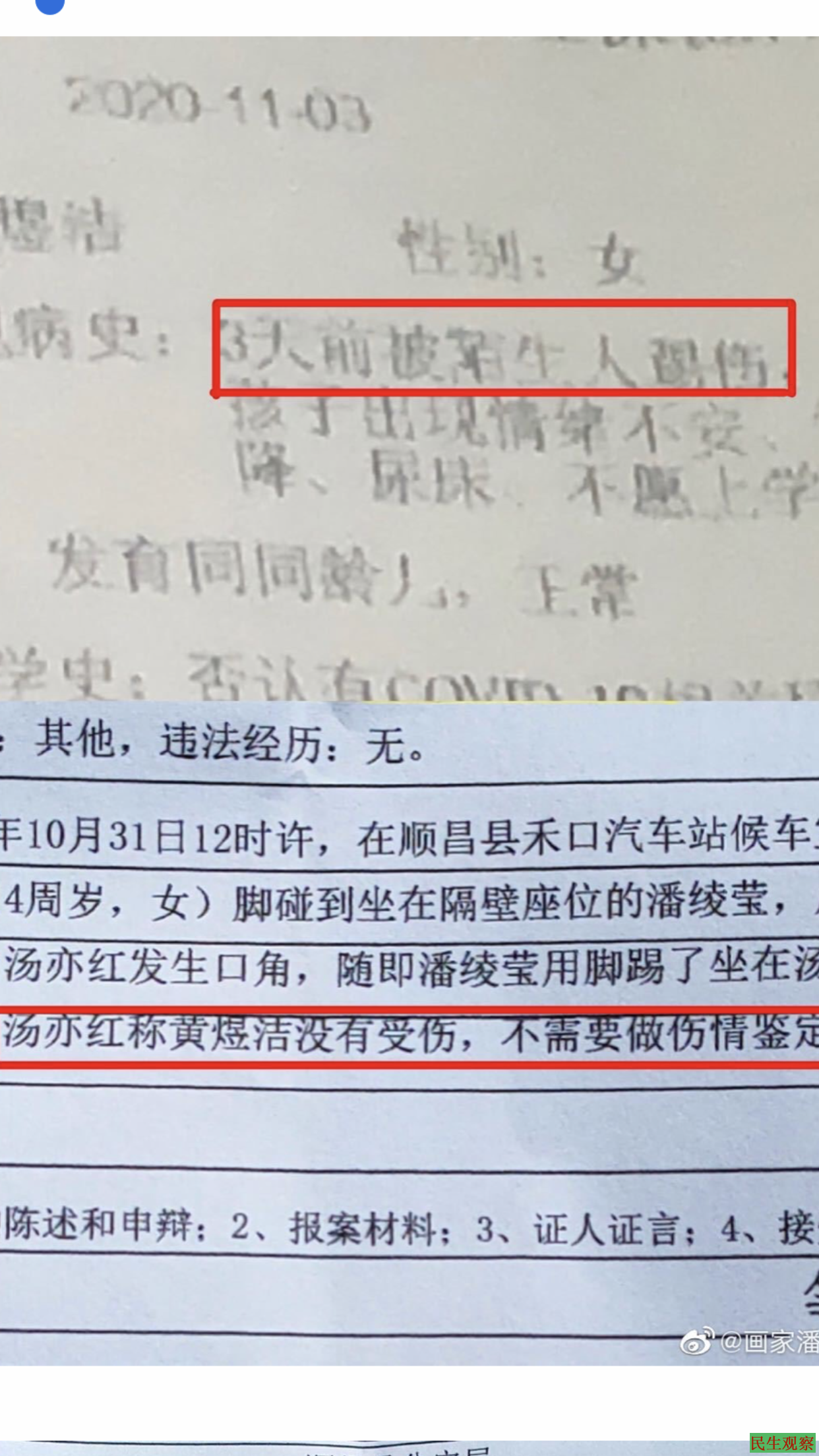 今天要诉说的是我的遭遇:2020年10月31日,我在福建省顺昌县汽车站侯车,一位刚喝完酒的妇女抱着四周岁的女儿坐在我旁边,其女儿踢了我,我就另换座位。故事如此简单,却是我恶梦的开始。