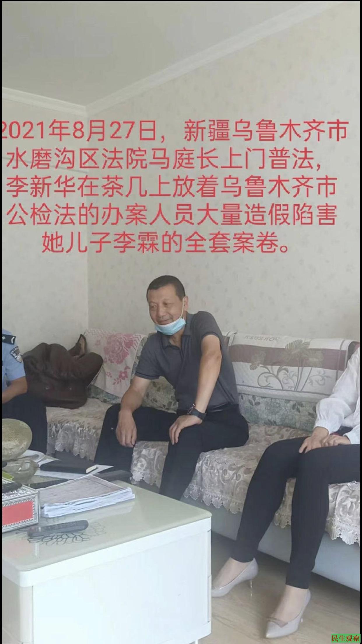 2021年8月27日,新疆乌鲁木齐市水磨沟区法院的马庭长上门来给我普法,陪同的有辖区龙盛街副书记(女)、一位社区民警、一位社区干事。