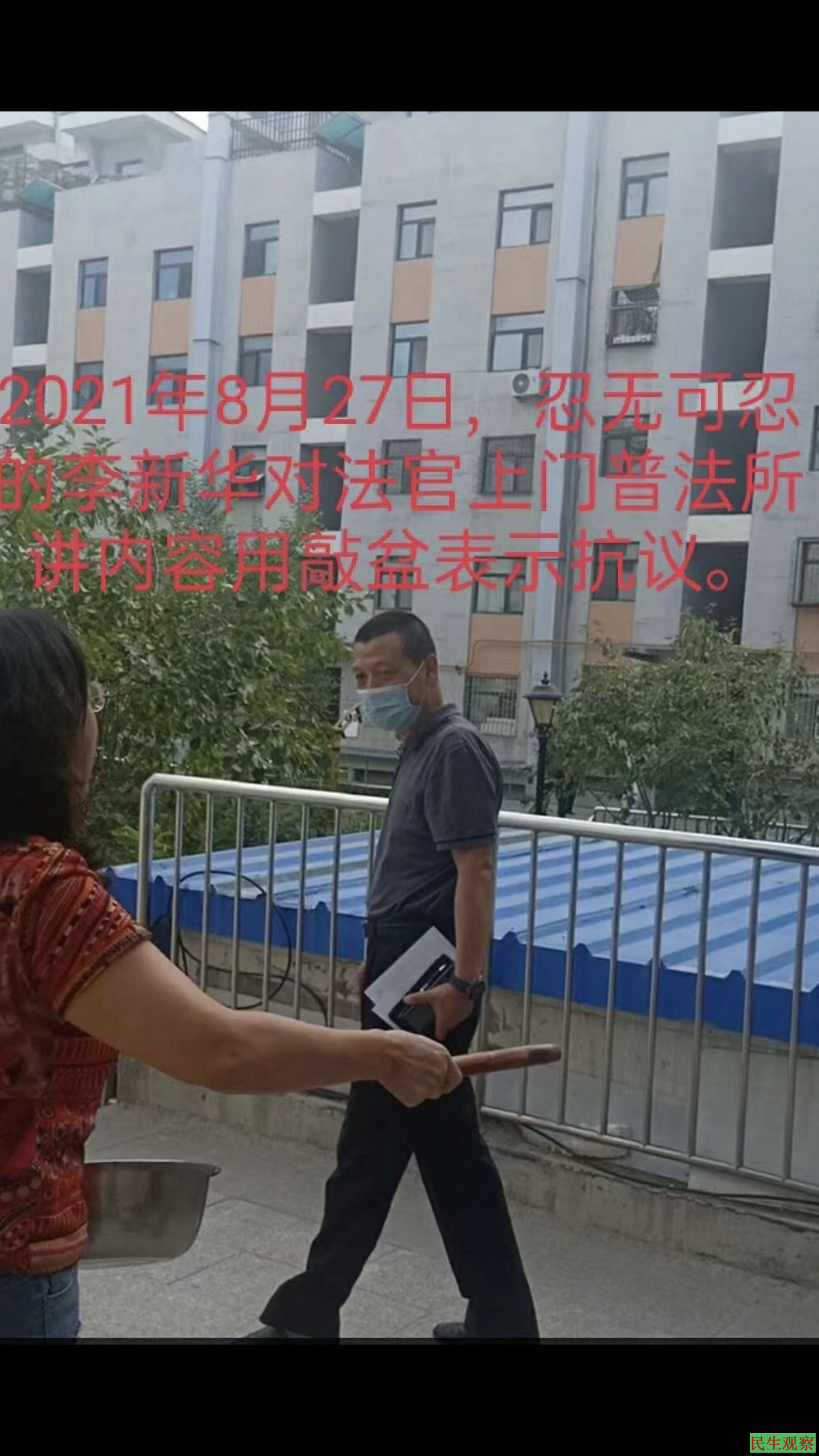 【民生观察2021年9月12日消息】2018年2月,辽宁沈阳人李霖因在推特上发布新疆现状信息,被新疆当局以“煽动颠覆国家政权罪”判刑4年,其母李新华一直为儿子奔走喊冤,遭当地维稳人员监控打压。2021年8月27日,新疆乌鲁木齐市水磨沟区法院的马庭长等人上门来给李新华普法,遭到她敲盆抗议,并怒斥法官有法不依,知法犯法。