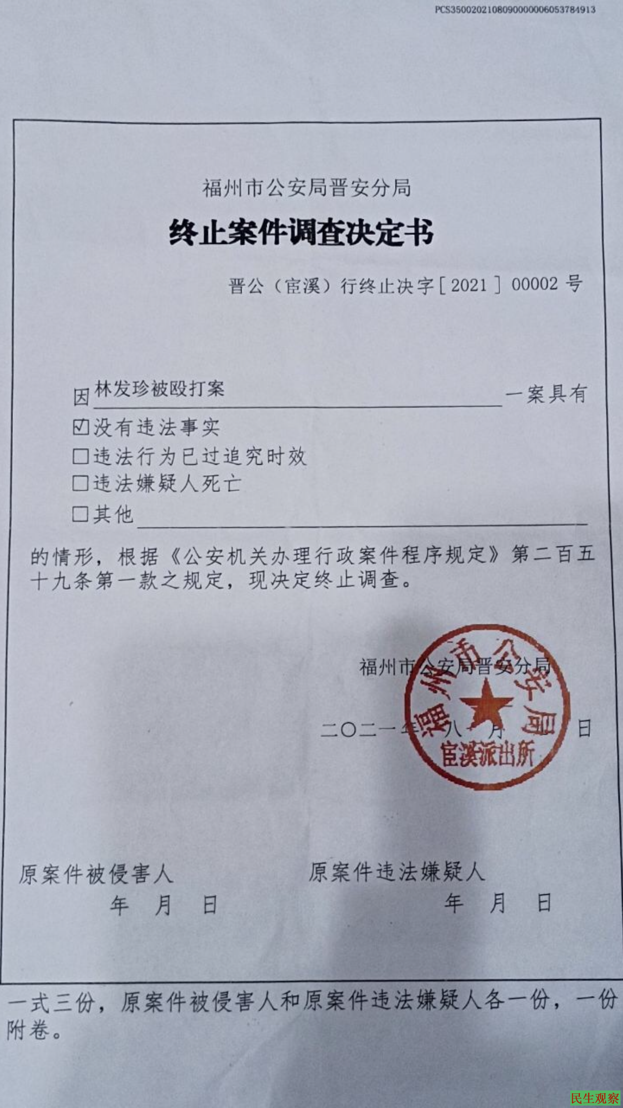 【民生观察2021年9月21日消息】日前,家住福州市新店镇西园村579号的林发珍收到福州市公安局晋安分局终止案件调查决定书“晋公(宦溪)行终止决字【2021】00002号”,其内容竟说“林发珍被殴打案,没有违法事实,决定终止调查”。对此林发珍痛揭当地警匪勾结祸害一方,真是岂有此理!