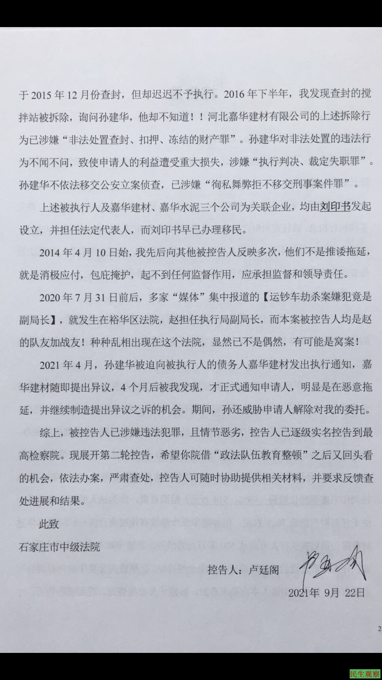 【民生观察2021年9月23日消息】河北石家庄市裕华区法院打脸中共中央“全面依法治国”,啪啪作响……。2021年9月22日,卢廷阁律师发布了系列维权通报之十七,开始第2轮维权,向石家庄市中级法院提起控告。