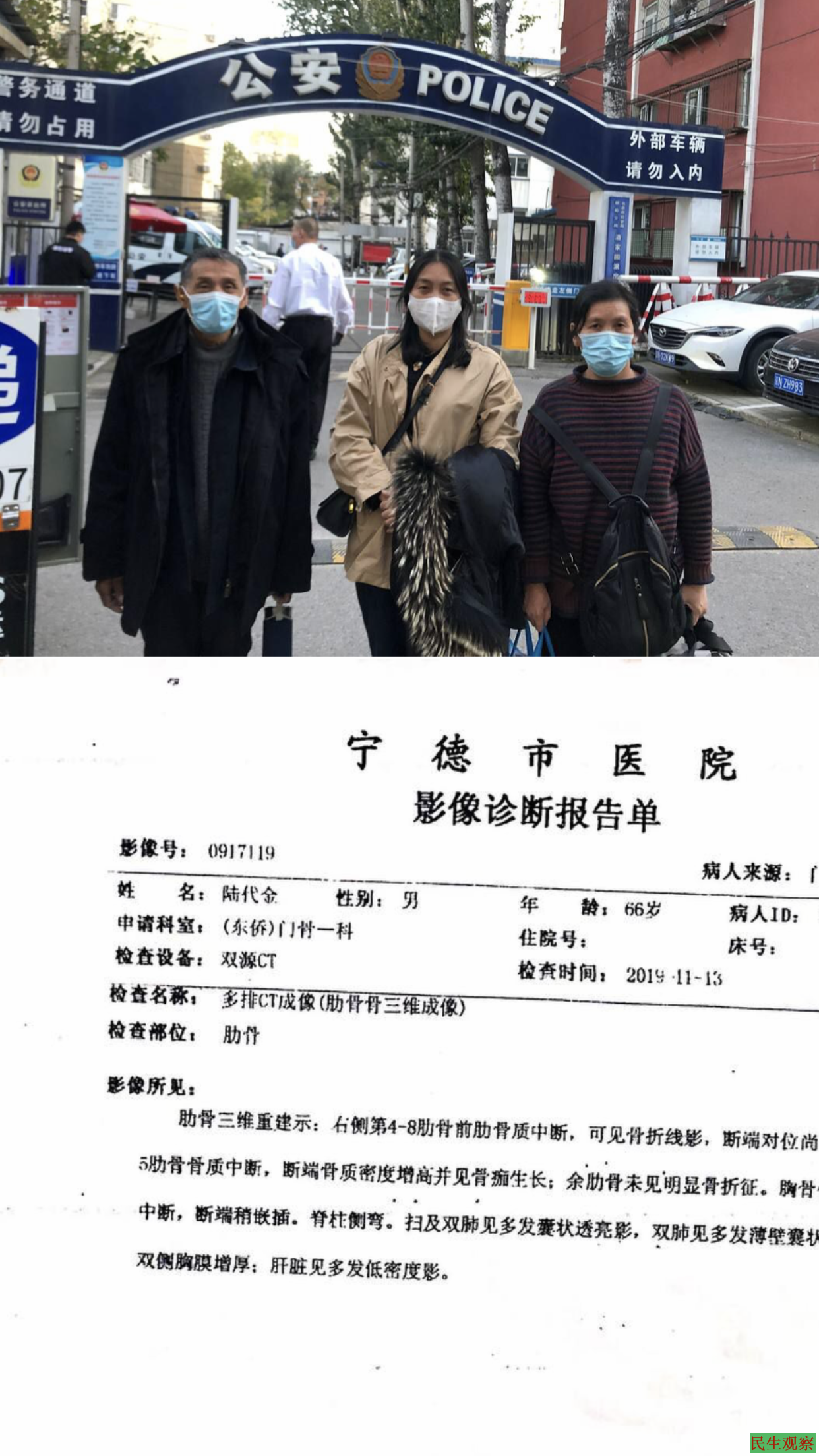 【民生观察2021年10月30日消息】本网获悉,2021年10月27日上午,福建人权捍卫者陆祚钰陪同父亲陆代金和同乡李穗财前往北京市朝阳区潘家园大厦前的打人现场,即两年前父亲陆代金和李穗财遭福建屏南县官员指使十几个黑保安围殴致伤的地方,当时陆代金肋骨被打断5根,一根胸骨骨折,李穗财也是被打得伤痕累累。陆祚钰随即打电话110报警,不久后潘家园派出所值班民警回拨来电话,陆祚钰在电话中给民警说明了报警原因,要求立案侦查,并请求将打人凶手和指使人绳之以法!但该民警不耐烦地说:“你知道报警有时效的吗?两年了你们才来报警。”然后就挂了电话。