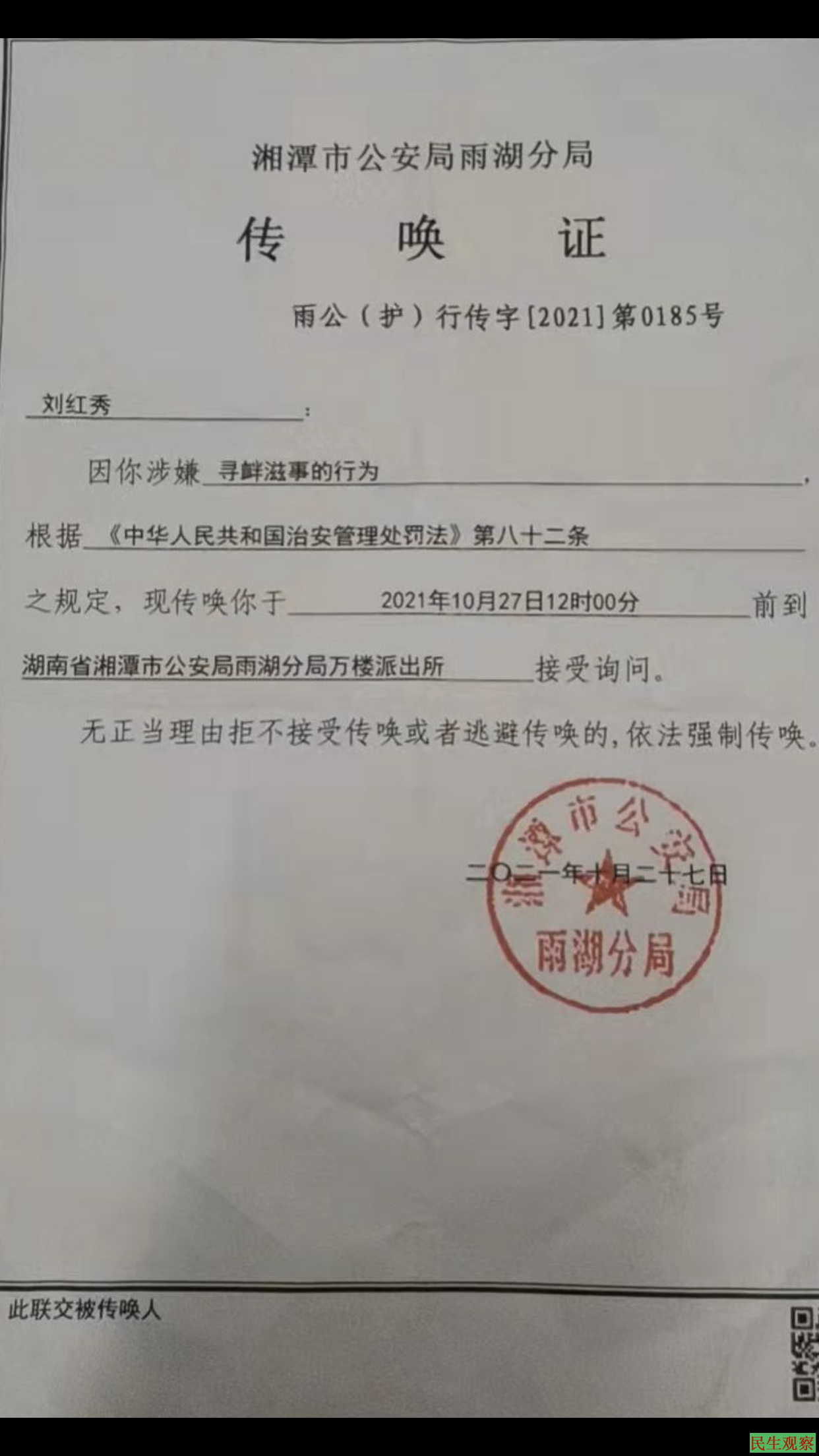 刘红秀:“我被一路暴力押送,至10月27日早上5点多到达万楼派出所。到派出所后,又被开了一张由湘潭市公安局雨湖分局出具的《传唤证》,期间做了几次笔录,直到10月28日晚上21点多才放我出来,并把在北京强抢我的手机还我,但又不让我家兄接我上车回家,万楼街道办事处的工作人员把我押送至兄长家,兄长家门口早有4个不明身份的人守在门口。”