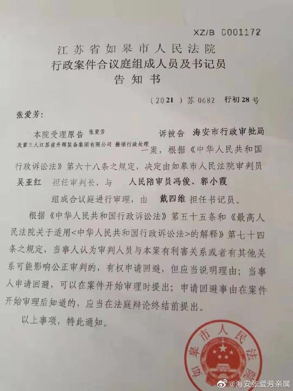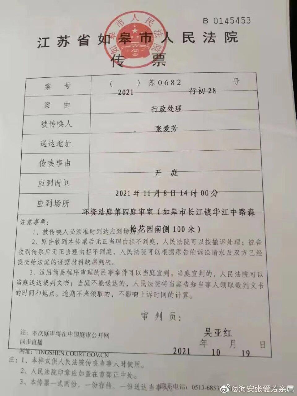 据张爱芳亲属反映:2021年11月9日,距离我们家一家四口失踪超过24小时,11月8日下午两点我姑妈张爱芳本应该前去如皋开庭(被告是海安环保局)。