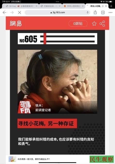 【民生观察2022年2月23日消息】江苏徐州丰县“铁链女”事件在网络发酵后,持续引发全国网民的高度关注。中国官方媒体先后发出4份前后矛盾的通报,并称“铁链女”杨某侠原名叫小花梅,是云南福贡县亚谷村人。为一探事实真相,前云南信息报调查记者铁木(郭敏)和马萨,联袂去云南亚谷村采访,揭出小花梅的一些真实信息,震动四方。2022年2月22日,铁木(郭敏)被昆明警方传唤,当天下午时分获释回家。其大致问话内容就是要求他对铁链女事件禁声。