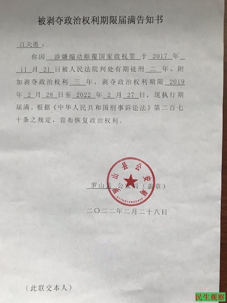 2022年2月28日下午3点,河南省罗山县灵山镇党委黄书记和万主任车接江天勇和其父母到村部,派出所宣读了剥权期满告知书并让江签字,走完程序,江天勇在执法记录仪前指控了公安非法限制了他人身自由三年。