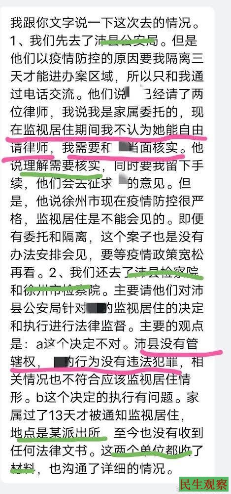 2、我们还去了沛县检察院和徐州市检察院。主要请他们对沛县公安局针对乌衣的监视居住的决定和执行进行法律监督。主要的观点是: