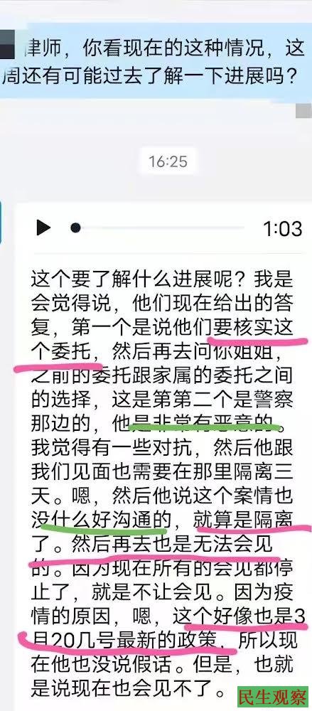 首先,沛县警方要核实乌衣妹妹对律师的委托书,再去问乌衣是否同意,因为乌衣已经(应该是在有司推荐下)请了两位律师。一般都是在别无选择的情况下,请有司推荐律师。有司肯定不希望乌衣请外边的律师。律师还需要隔离3天,才可以进入警方办案区域了解案情。就算是隔离了,也不会让会见乌衣。根据当地最新规定,因疫情原因,所有的会见都停止了。