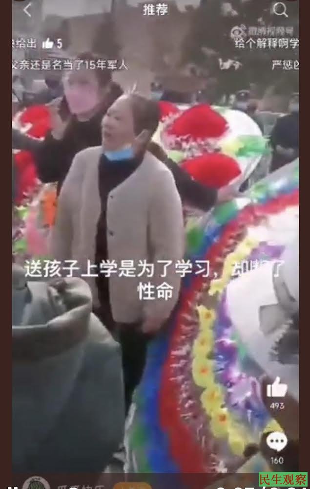 视频中,死者父亲在渔沟中学校门口拿着儿子的遗像在哭诉:“我保卫祖国15年,光溜溜仅一个孩子,在学校被打死了!”