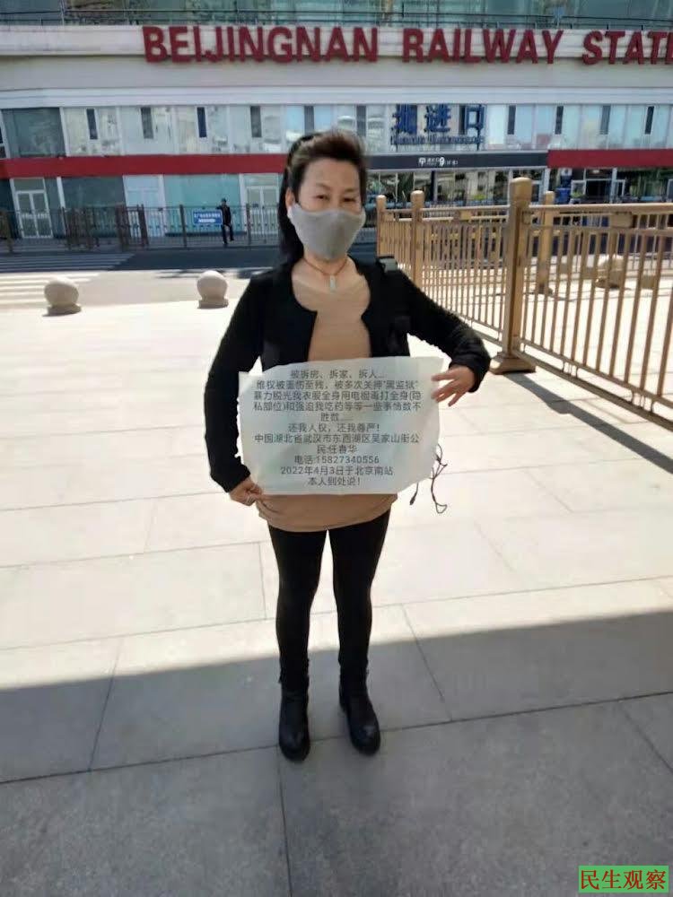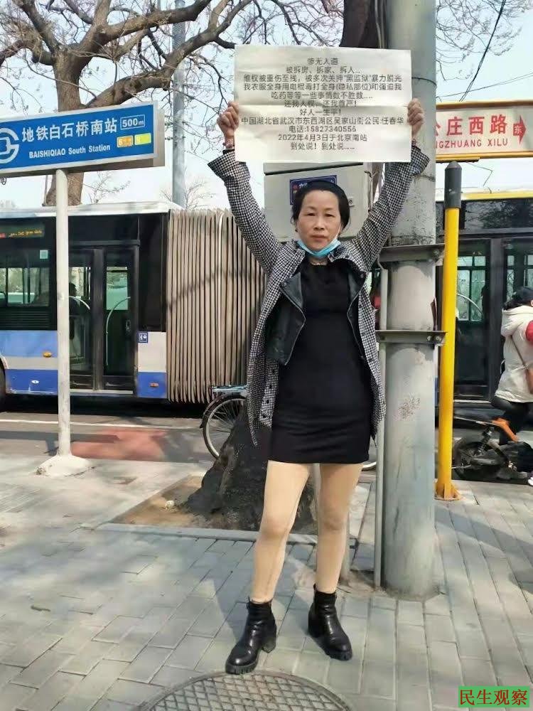 【民生观察2022年4月14日消息】湖北武汉维权访民任春华在北京南站进站口举牌抗议,任春华还在北京全国妇联群众来访接待室门口举牌抗议:A4白纸写着:被拆房、拆家、拆人……还我们妇女合法权益!