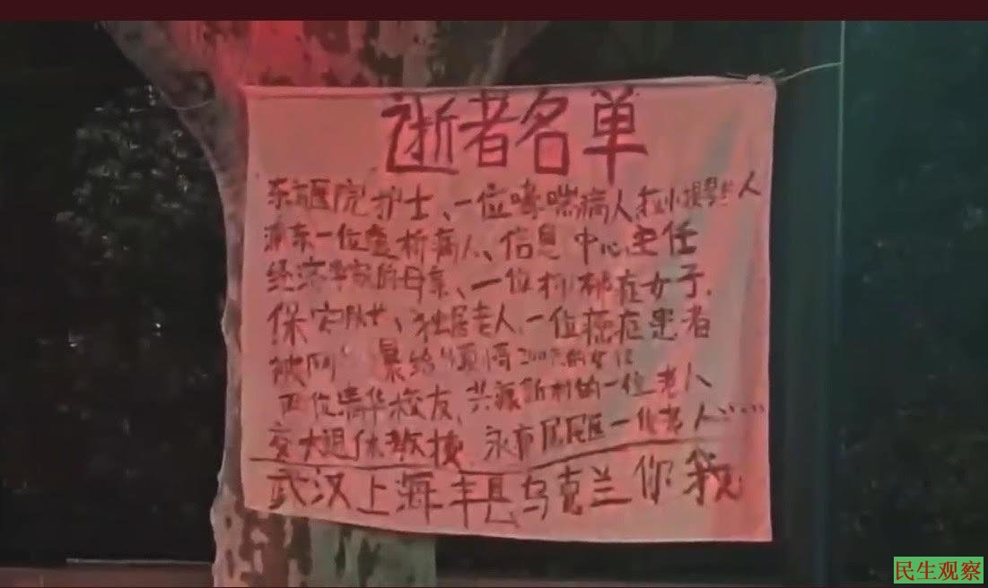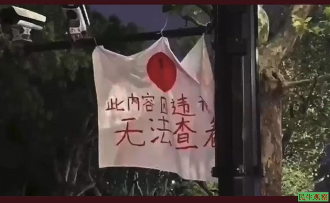 据悉,4月17日夜晚,有三位上海市民在华山路悬挂了4条标语,内容分别是:1、“反对无限制封城”;2、“人们正在死去”;3、“逝者名单:东方医院护士、一位哮喘病人、拉小提琴的人、浦东一位透析病人、信息中心主任、经济学家的母亲、一位抑郁症女子、保安队长、独居老人、一位癌症患者、被网暴给快递小哥200元的女孩、两位清华校友、共康新村的一位老人、交大退休教授、永卢居民区一位老人……;4、“此内容因违规无法查看”。