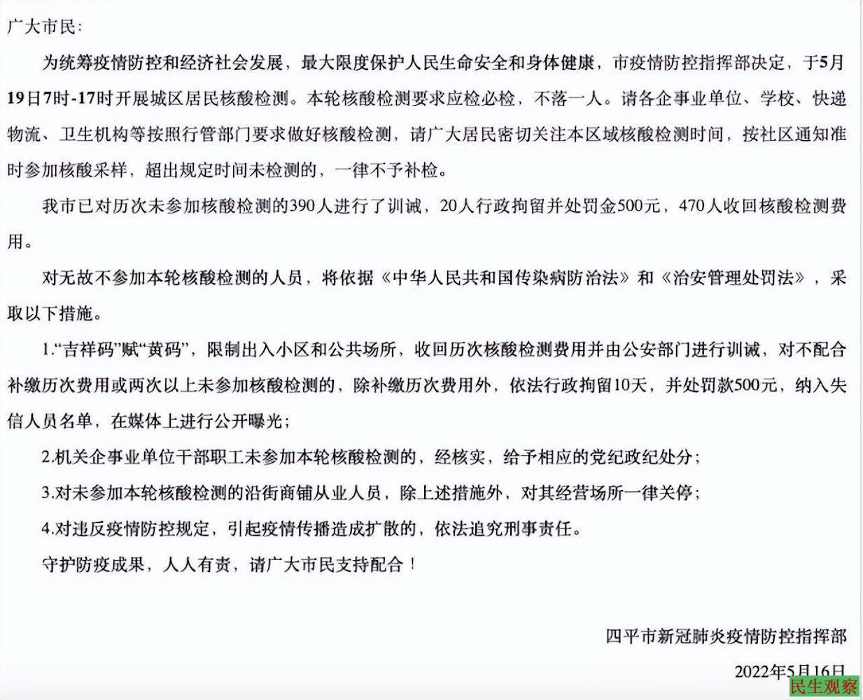 我们注意到,此前四平市新冠肺炎疫情防控指挥部曾于5月16日发布通告称,对无故不参加该轮核酸检测的人员,将依据《中华人民共和国传染病防治法》和《治安管理处罚法》,采取下列措施: