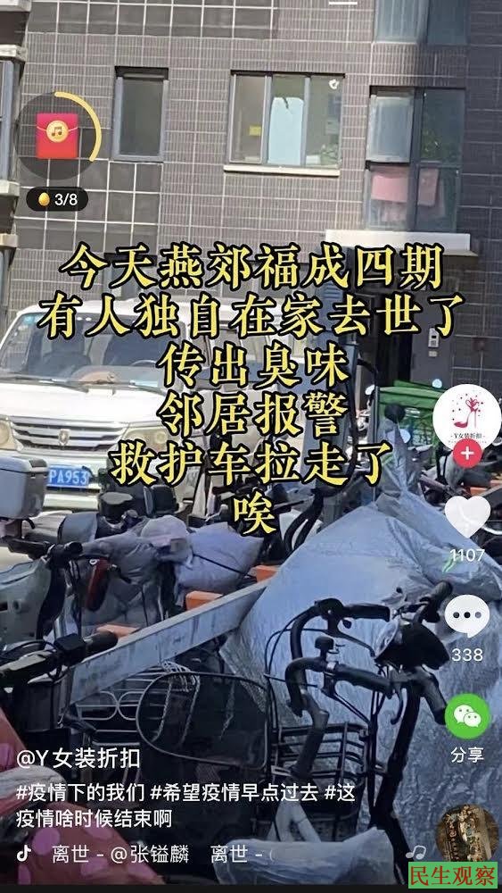 另据网络消息,昨日,燕郊福成四期有一年轻人独自惨死在家中,尸体腐烂后传出臭味,邻居发现后报警,被救护车上门拉走了。