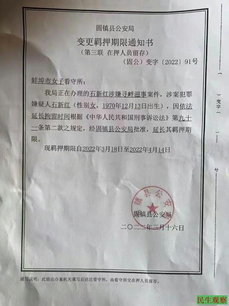 石新红在3月14日被当局在北京非法绑架遣返抓回当地后,3月15日被非法构陷寻衅滋事关押在当地蚌埠市女子看守所,这是当局蚌埠市公安局出具的法律文书依据,随后当局在此出局延期关押法律手续为,关押时间为改于2022年3月18日至2022年4月14日。两份法律手续相隔三天时间后改为延期拘押在蚌埠市女子看守所。