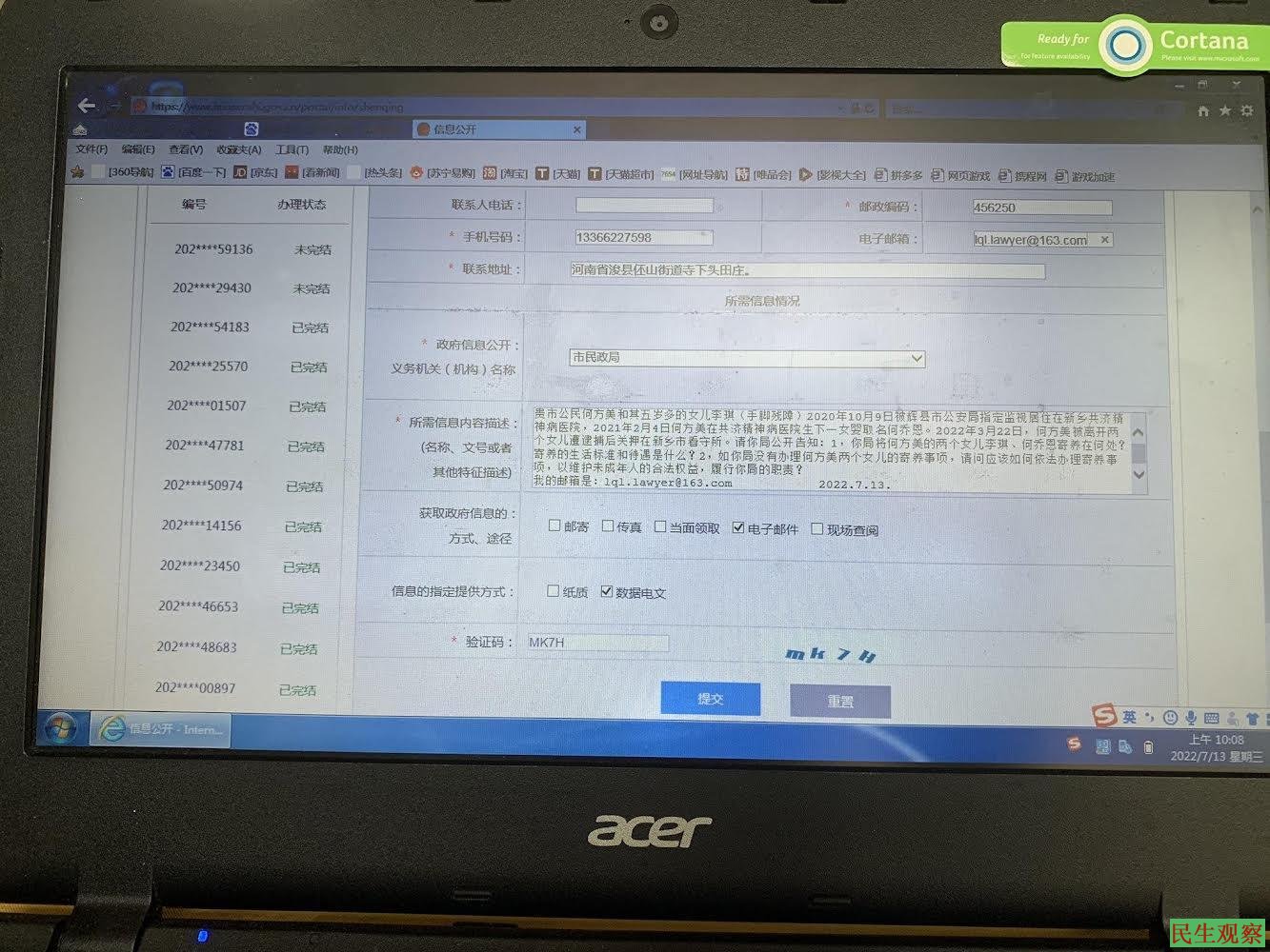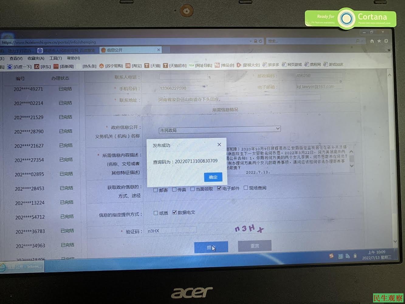 【民生观察2022年7月15日消息】河南辉县“疫苗宝宝之家”发起人、维权人士何方美,因女儿疫苗致残维权,在向市政府门前招牌泼漆后被辉县警方带走,后被指定监视居住在新乡共济精神病医院,在被监居期间生下一女,之后被以涉嫌重婚罪、寻衅滋事罪逮捕,现羁押在新乡市看守所。7月13日,蔺其磊律师向辉县市民政局申请信息公开其两个女儿的寄养情况。