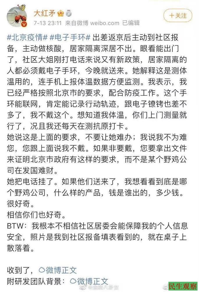 7月13日网友“大红矛”发微博称:出差返京后主动到社区报备,主动做核酸,居家隔离深居不出。眼看能出门了,社区大姐刚打电话来说又有新政策,居家隔离的人都必须戴电子手环,今晩就送来。她解释这是测体温用的,连手机上报体温数据方便监测。我表示,我已经严格按照北京市的要求,配合防疫工作。这个手环能联网,肯定能记录行动轨迹,跟电子镣铐也差不多了,我不戴这个。想知道我体温,你们上门测量就行了,况且我还每天在测抗原打卡。
