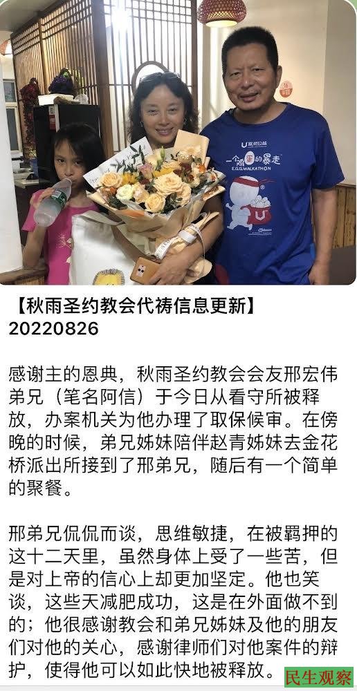 2022年8月26日秋雨圣约教会发出代祷信息:感谢主的恩典,秋雨圣约教会会友邢宏伟弟兄(笔名:阿信),于今日从看守所被释放,办案机关为他办理了取保候审。在傍晚的时候,弟兄姊妺陪伴赵青姊妹去金花桥派出所接到了邢弟兄,随后有一个简单的聚餐。