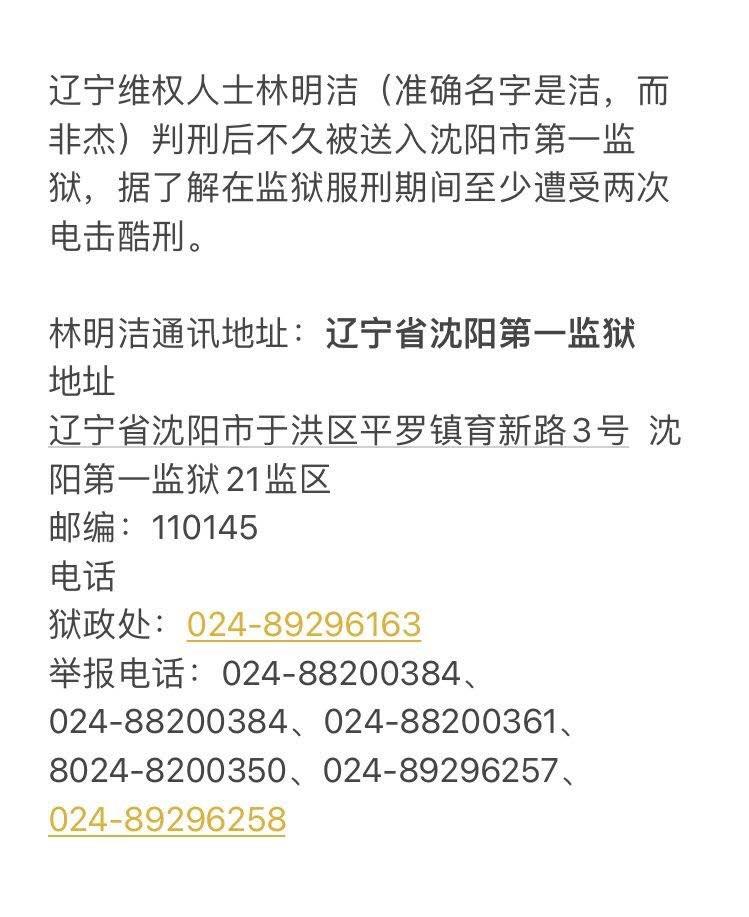林明洁通讯地址:辽宁省沈阳市第一监狱。地址:辽宁省沈阳市于洪区平罗镇育新路3号沈阳第一监狱21监区邮编:110145狱政处电话:024-89296163