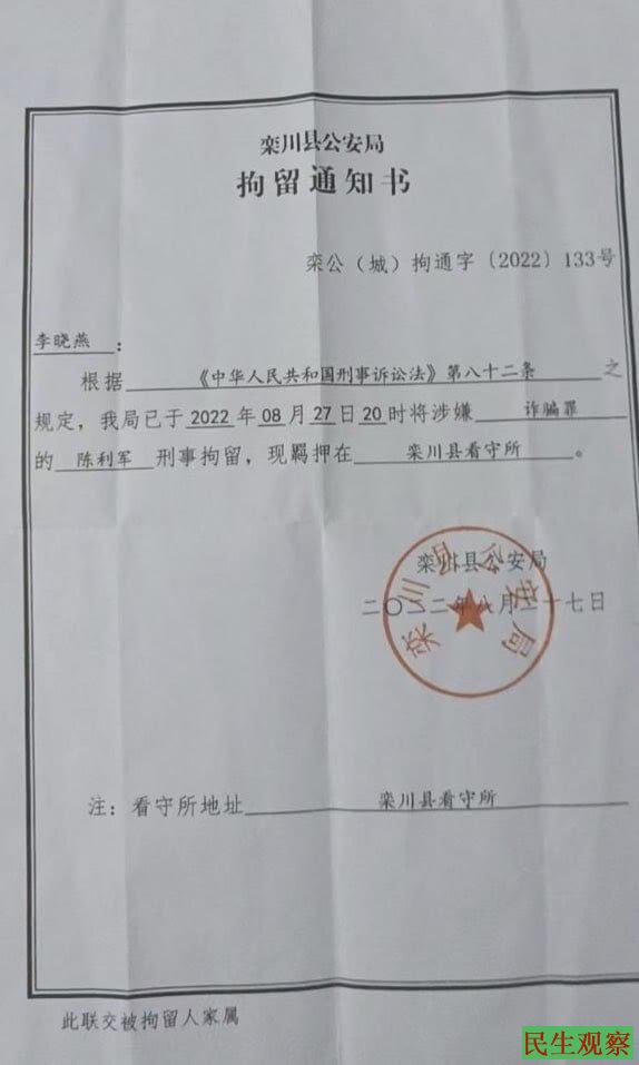 后家人收到拘留通知书,得知陈利军于2022年8月27日被栾川县公安局以涉嫌“诈骗罪”刑拘,现羁押在栾川县看守所,至今未归。