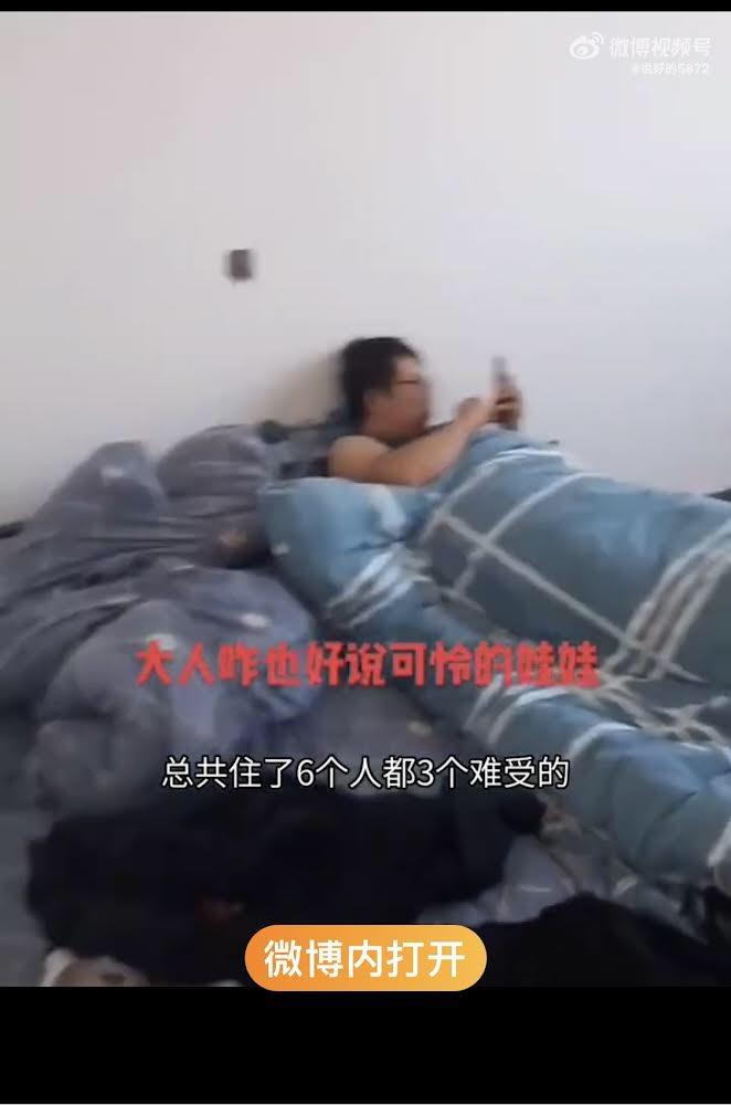 根据网友发出的视频显示,在一间房里有简单的桌椅,有4张单人床,其中有俩人蒙着被子睡在床上,一名身穿蓝色衣服的小女孩站在床边,另外一间房里有一张双人床,其中一名男子坐在床上,另一人则睡在床上。