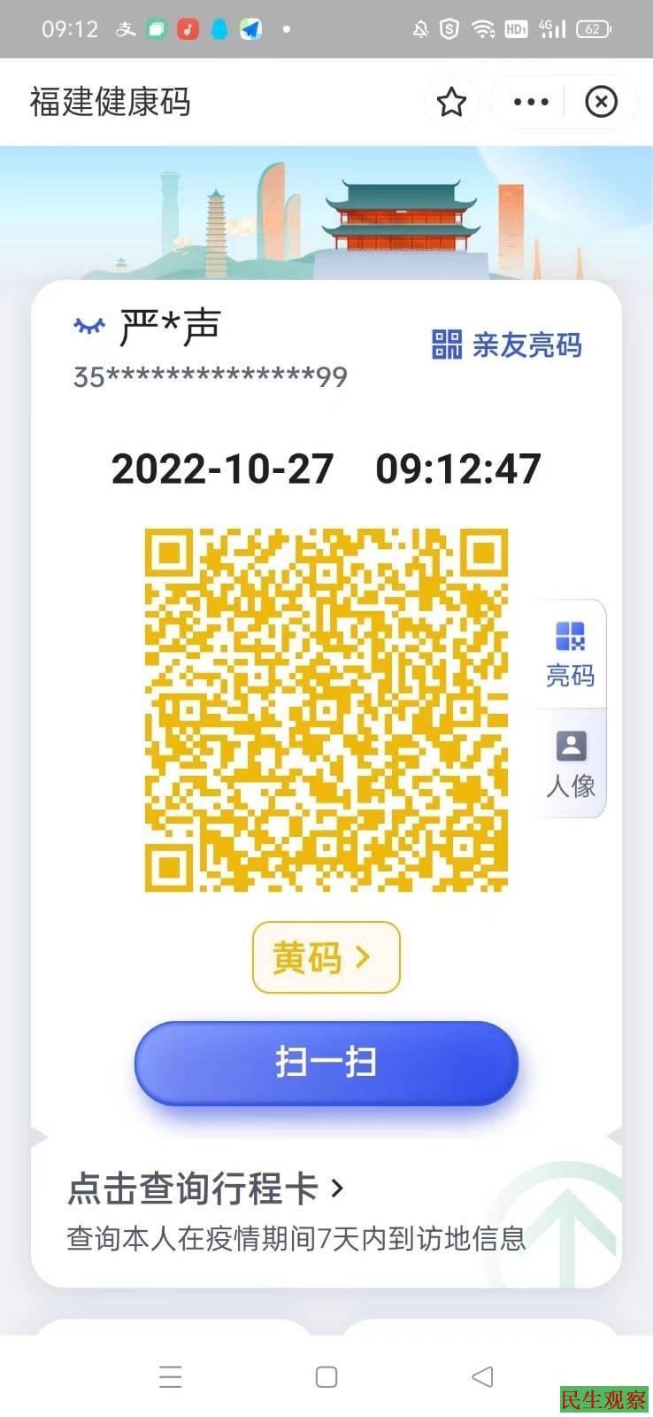 【民生观察2022年11月8日消息】自10月22日福州开始出现新一轮新冠疫情以来,政府为了动态清零,对许多小区进行静默封控。同时当局为了维稳需要,借口疫情防控,通过封控或健康码赋黄码及红码方式,对严心声、叶钟、唐兆星、林应强、熊凤莲、林发珍等人,进行管控。