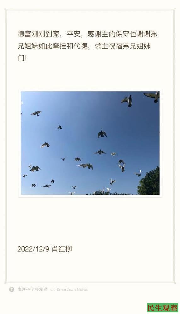 肖红柳姊妹发帖告知,覃德富长老刚刚到家,她谢谢大家的牵挂和代祷。求主祝福这个为义受逼迫的家庭。