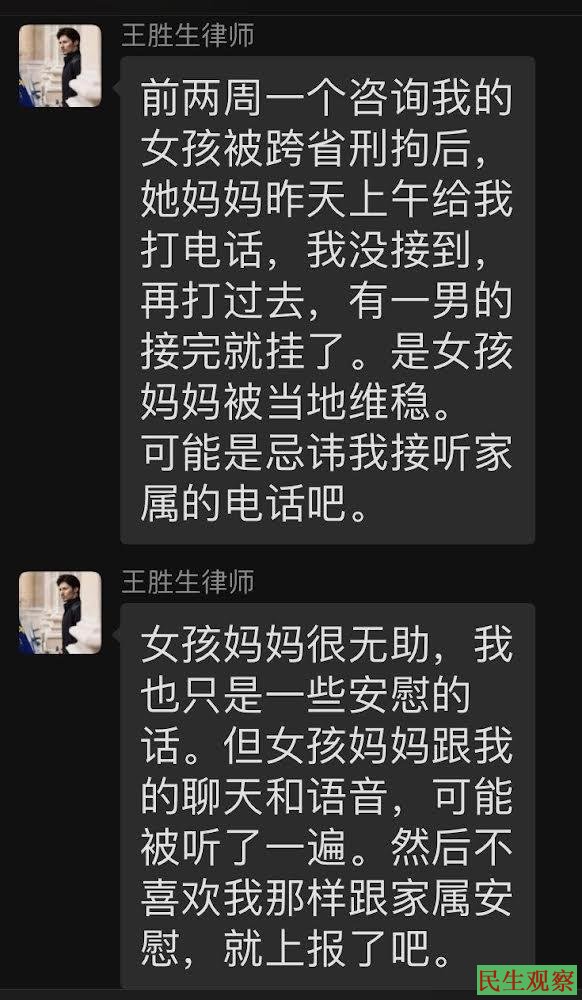 王胜生律师称:“前两周一个咨询我的女孩被跨省刑拘后,***妈昨天上午给我打电话,我没接到,再打过去,有一男的接完就挂了。是女孩妈妈被当地维稳,可能是忌讳我接听家属的电话吧。”