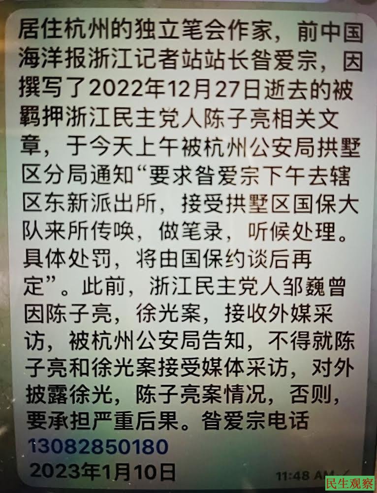 【民生观察2023年1月11日消息】2023年1月10日,居住在杭州的独立笔会作家,前中国海洋报浙江记者站站长昝爱宗,因撰写了在羁押期间死亡的浙江民主党人陈子亮的相关文章,被杭州警方传唤并做笔录。