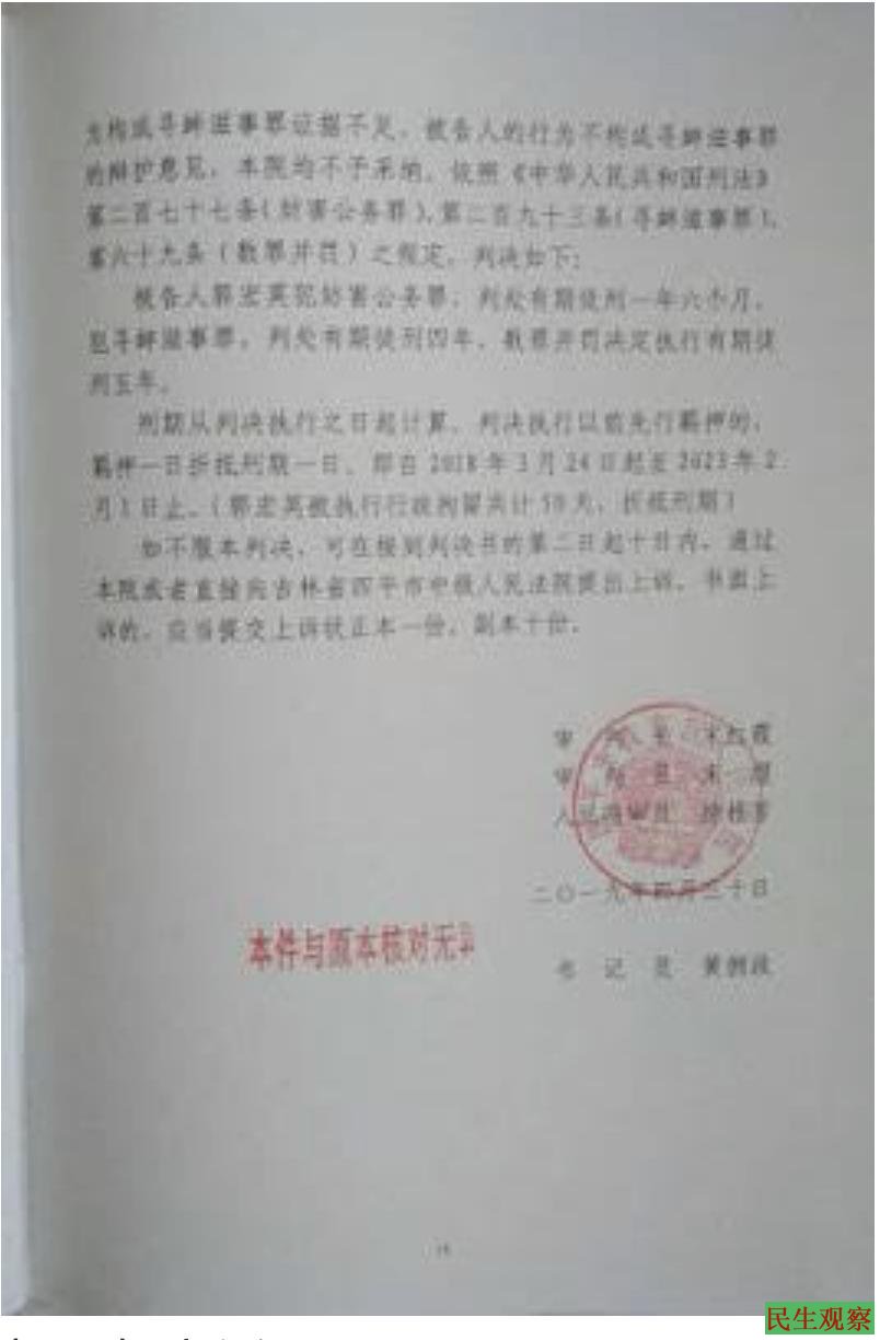 2019年4月18日,其案在吉林省四平市铁东区法院开庭受理,两天后被以“妨碍公务罪”(判1年6个月)、“寻衅滋事罪”(判4年),二罪并罚共计五年六个月,最终执行实刑。