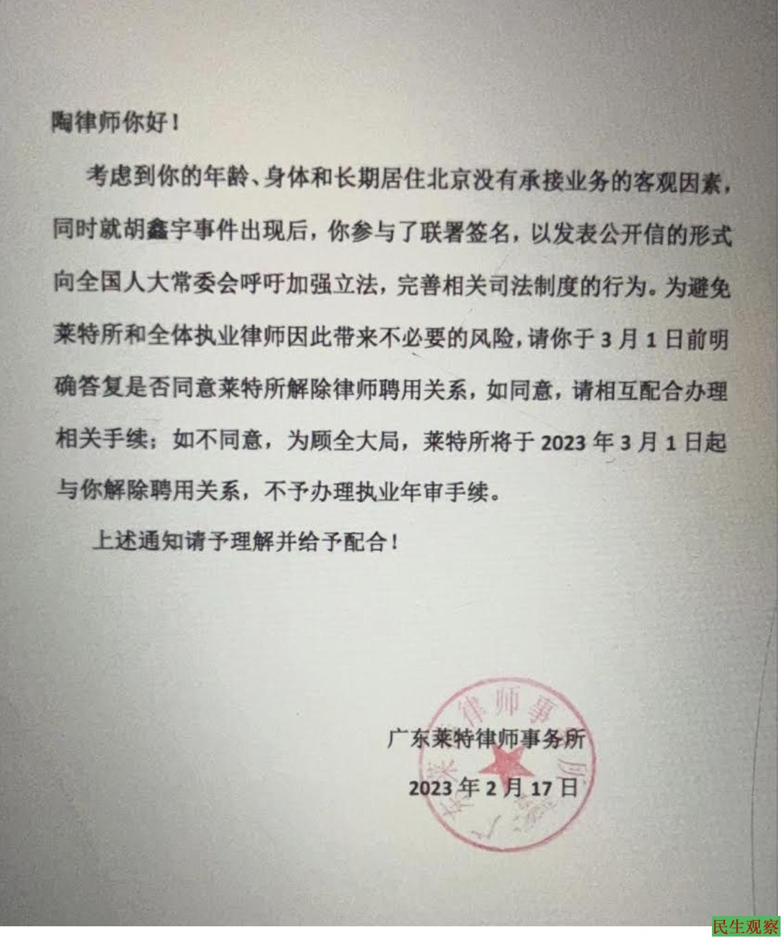 【民生观察2023年2月18日消息】陶波律师因关注胡鑫宇事件,于2023年2月17日收到广东莱特律师事务所的“通知”,称将于2023年3月1日起与他解除聘用关系,不予办理执业年审手续。