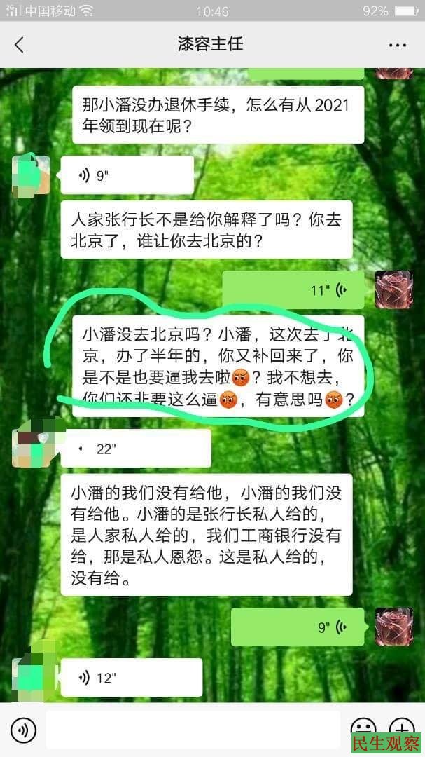 伍立娟要求银行给办理正常职工缴纳社保养老退休,这样工资高也稳定,银行不同意,到现在伍立娟也不同意这个方案退休,这是没有缴纳社保灵活就业退休,如果按照这个退休只有1200元工资,我工作了18年,由于没有生活来源我不同意按照驻京办秘书长丛景安排了驻京办三人,还有武汉公路段的乘警,下车后给我聊的条件是回来一定解决困难生活问题,银行信访局主任漆荣与行长胡琼在两会期间都说了,生活困难的问题有小潘的就有我伍立娟的,两会结束后就变卦不给过去一年半的,只给今年的,银行信访主任说小潘的钱是银行副行长张希武给的,那是他的事,我当时就说了如果是他私人给小潘的我要去纪委举报副行长张希武他与小潘是什么关系凭什么给小潘那么多钱,他副行长有家有其有儿女的人,与小潘无亲无故的。