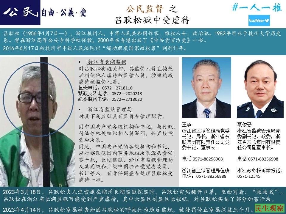 【民生观察2023年5月5日消息】浙江维权人士吕耿松在浙江长湖监狱关押期间,受到虐待,其在家属会见时呼救,而遭到监狱方面的处罚。