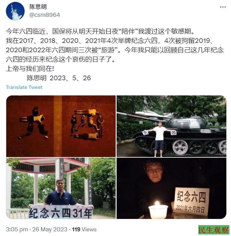 2023年5月26日,陈思明发出如下推文:今年六四临近,国保将从明天开始日夜“陪伴”我渡过这个敏感期。