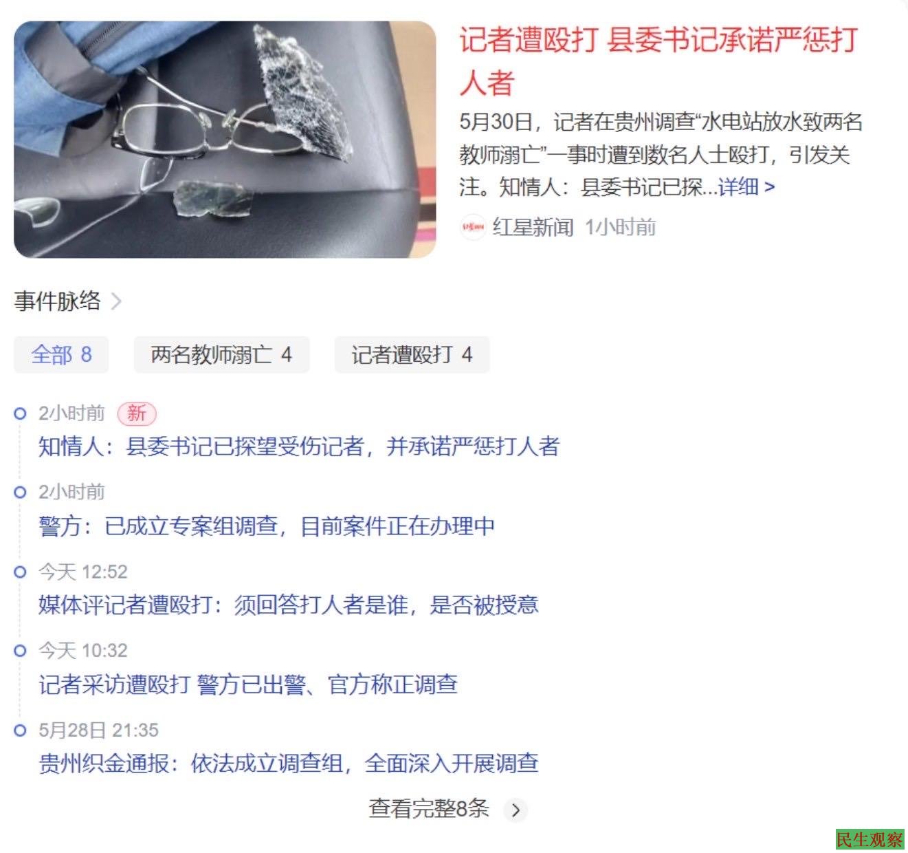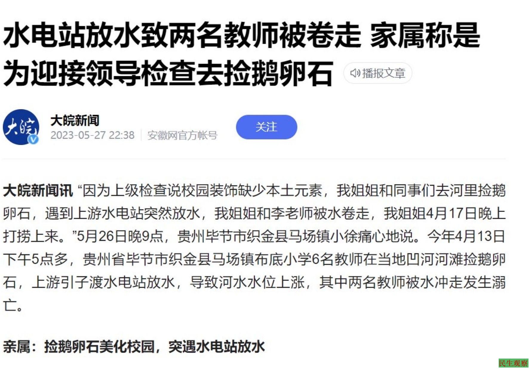 【民生观察2023年5月31日消息】2023年5月30日,一名记者在贵州省毕节市织金县调查“两教师溺亡”事件时,被三名不明身份人员围殴。根据家属说法,两名教师是为了迎接领导检查去河里捡鹅卵石妆点校园时,突遇水电站放水被冲走溺亡。