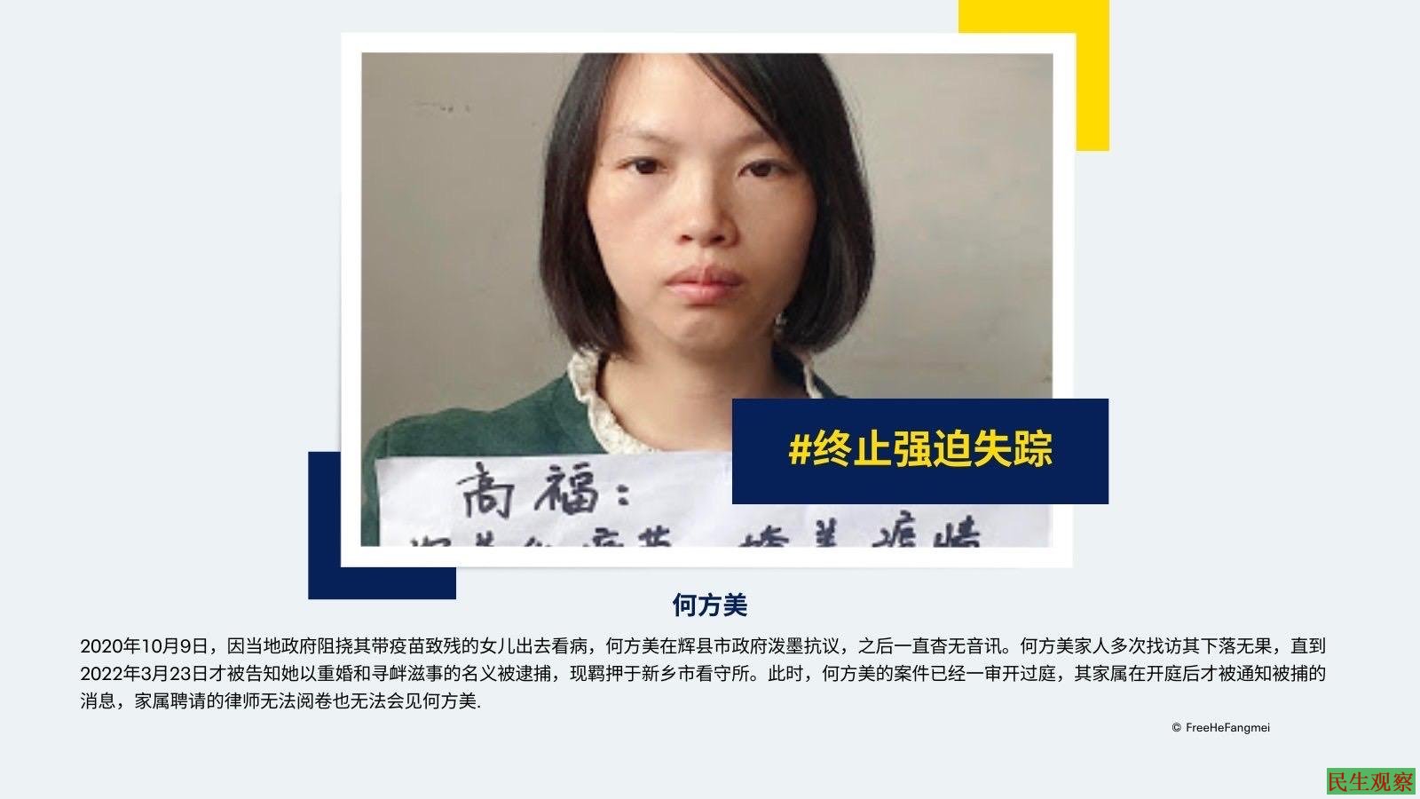 【民生观察2023年6月2日消息】中国维权团体“疫苗宝宝之家”发起人何方美已被捕两年多。据知情人了解,此案一审开庭审理近一年,仍未宣判,何方美本人处在被超期羁押中,而她的两个女儿至今仍滞留在精神病院。近日,何方美写信委托姐姐照顾孩子,但遭到辉县相关部门的阻扰。