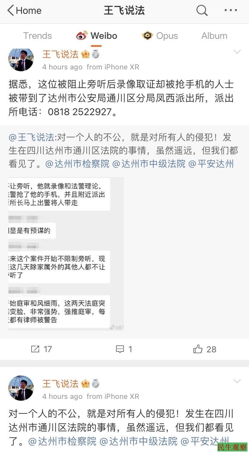 王律称:“对一个人的不公,就是对所有人的侵犯。发生在四川达州市通川区法院的事情虽然遥远,但我们都看见了。”