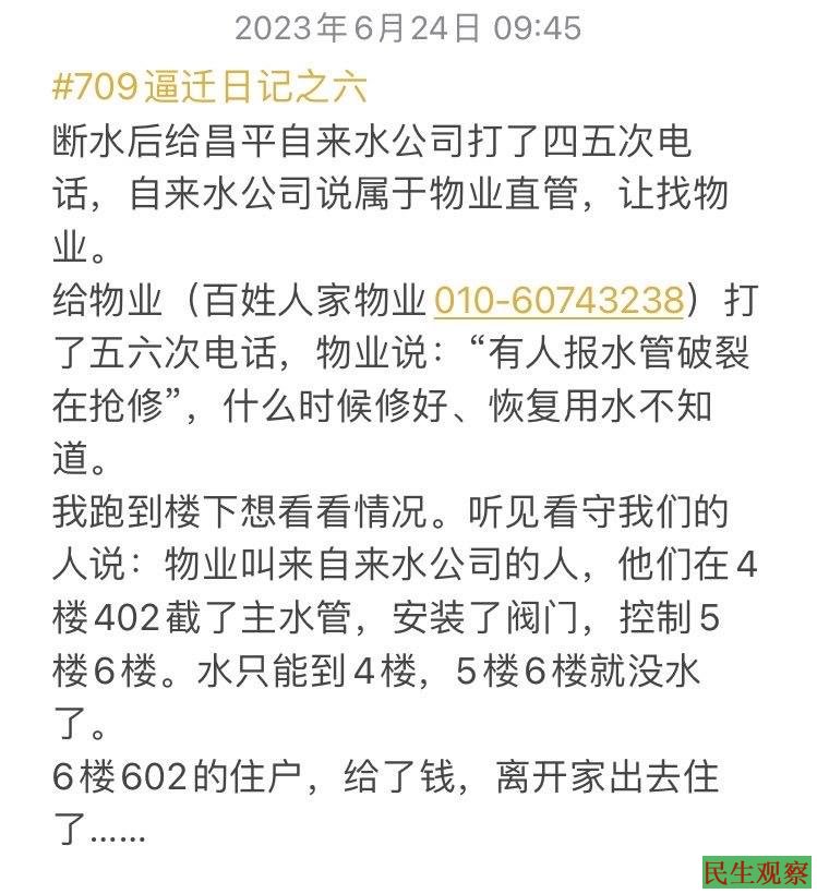 李文足给物业(百姓人家物业:010-60743238)打了五六次电话,物业说:“有人报水管破裂在抢修,至于什么时候修好、恢复用水不知道。”