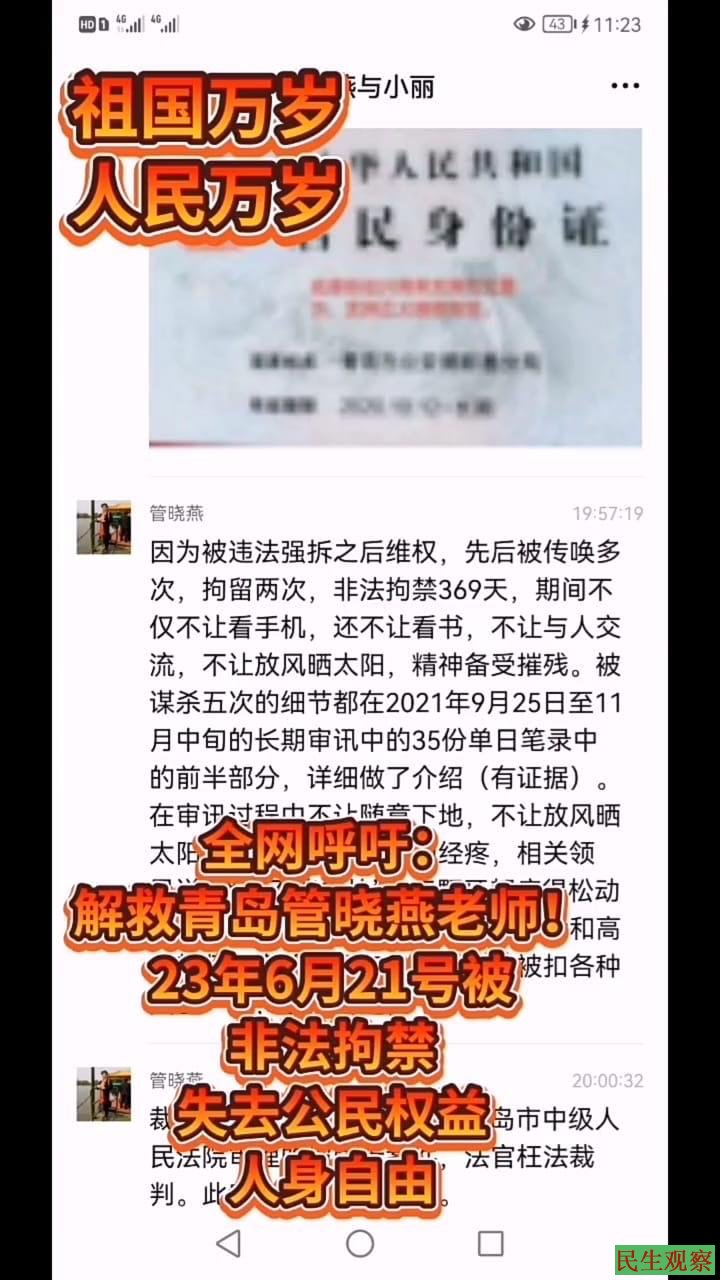 【民生观察2023年7月3日消息】自2021年9月24日遭抓捕的山东青岛女教师管晓燕在被关押一年多后,于2022年10月获释回家。