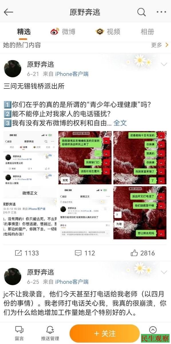 【民生观察2023年7月4日消息】一位江苏无锡抑郁症患者女生(网名:原野奔逃),因为在微博发布了一则带有消极倾向的微博后,连续遭到派出所警察骚扰两个月。近日,该名网友微博发文,要求无锡钱桥派出所停止对其家人的电话骚扰,并声明自己有发布言论的权利和自由。