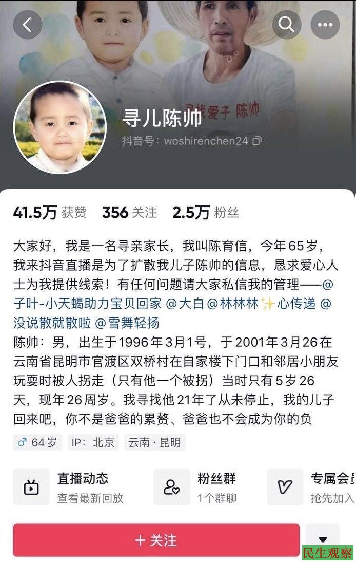 陈育信曾在抖音表示:“我寻找儿子21年了从未停止,我的儿子你回来吧,你不是爸爸的累赘、爸爸也不会成为你的负担。