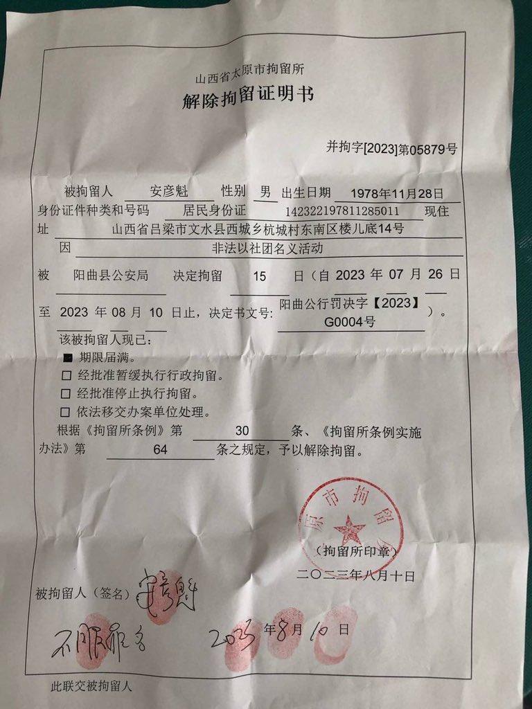 【民生观察2023年8月11日消息】7月下旬,太原郇城归正教会被行政拘留的四位肢体,现在只有王应杰弟兄和王瑛姐妹期满获释,而安彦魁传道和张乘豪弟兄,并没有被“释放”,后被汾阳法院执行局带走,今天下午得知,安彦魁和张乘豪被司法拘留15日,目前在离石区拘留所。