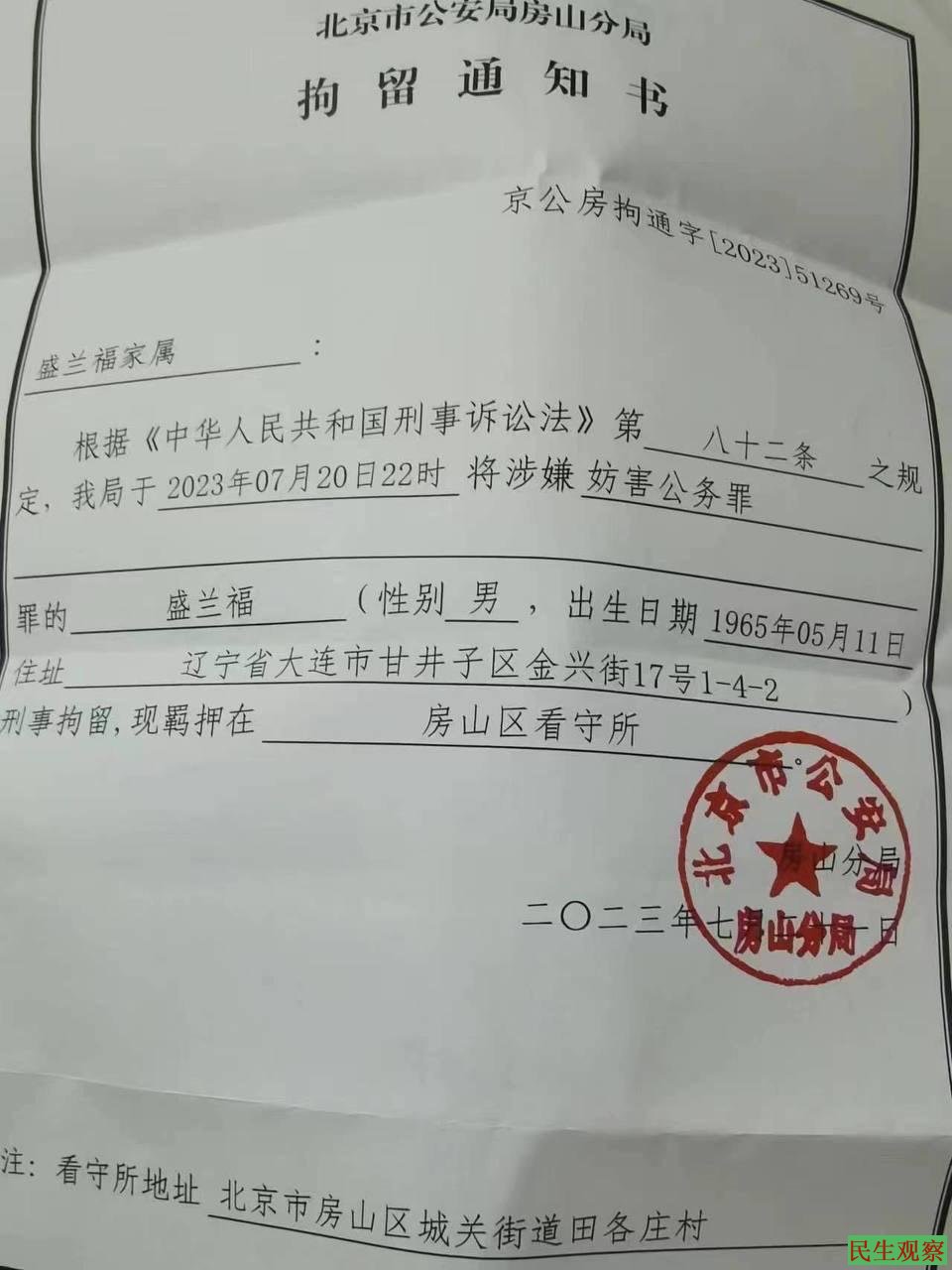 盛兰福本次拘留是因为起诉北京公安机关多次非法配合当地抓铺,案件程序到法院开庭审理期间,盛兰福在法院伦理被法院构陷妨碍公务罪遭到抓铺拘留,由北京公安局房山分局派出所在2023年7月20号晚上22点将盛兰福构陷入狱,盛兰福目前关押在北京房山看守所。目前没有联系上家人,还没有律师介入。