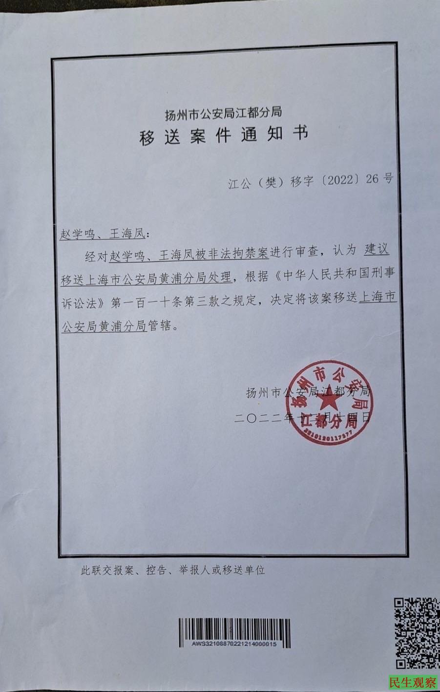 那么,有网友发出疑问,五里桥派出所为何要对一对老夫妇下毒手了?据称,真正原因是赵学鸣夫妇俩人,拿到了江苏扬州市公安局出具的文件及五里桥民警涂云青对其殴打致伤和非法拘禁的证据。