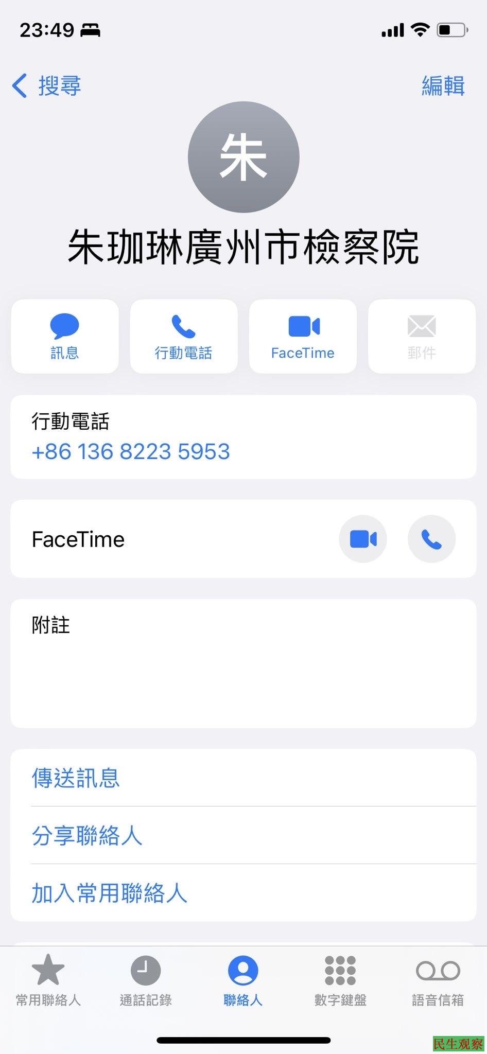 【民生观察2023年10月12日消息】现旅居荷兰的中国深圳维权人士林生亮,因给广州市检察院朱珈琳发送了其参与迫害黄雪琴和王建兵,被恶人榜征集中心收录榜单的信息,昨日林生亮的家人遭到广州国安和深圳国保的联合上门骚扰,他们要求其母亲交出手机,并威胁要把林生亮12岁的二女儿带往派出所。目前,在林生亮和家人的交涉下,广州国安态度缓和,表示只要将该手机取消绑定的ID即可,他们不会做其他任何事情。