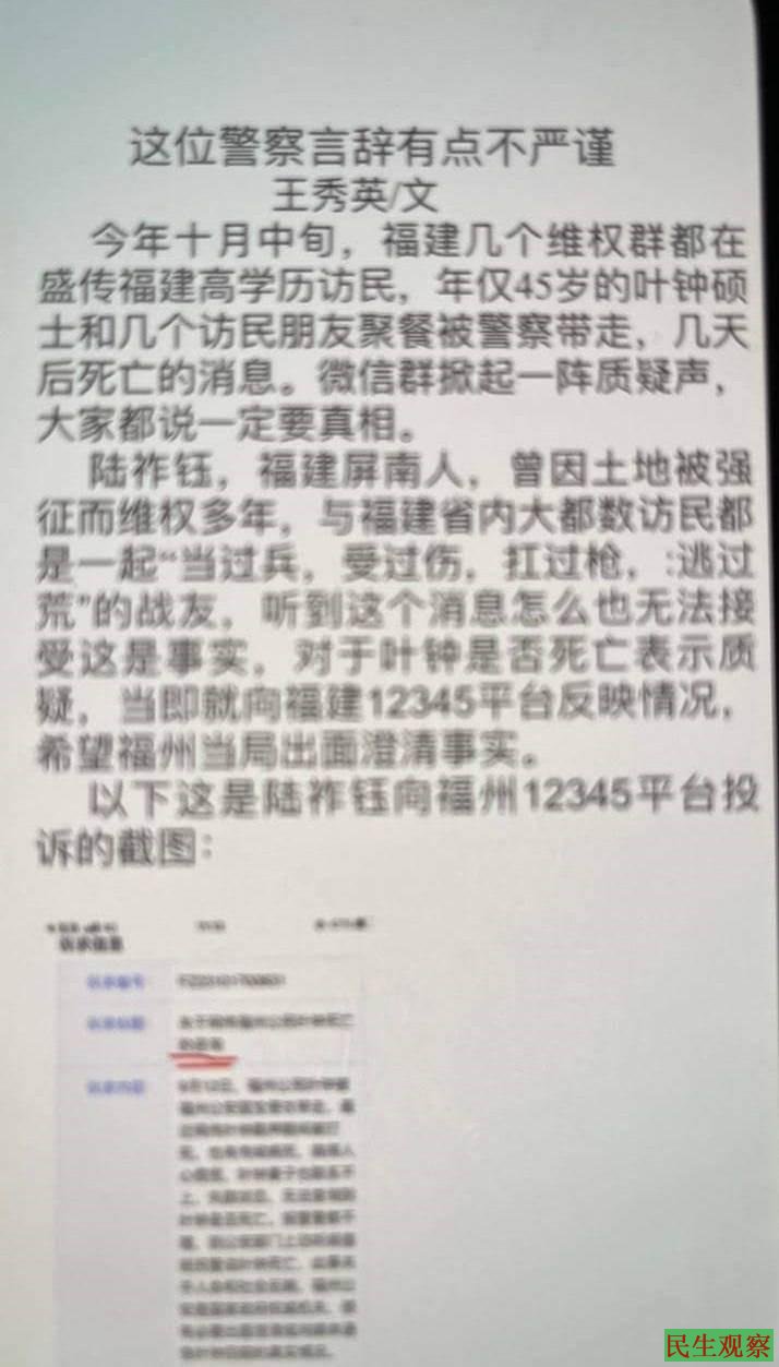 陆祚钰,福建屏南人,曾因土地被强征而维权多年,与福建省内大都数访民都是一起“当过兵,受过伤,扛过枪,:逃过荒”的战友,听到这个消息怎么也无法接受这是事实,对于叶钟是否死亡表示质疑,当即就向福建12345平台反映情况,希望福州当局出面澄清事实。