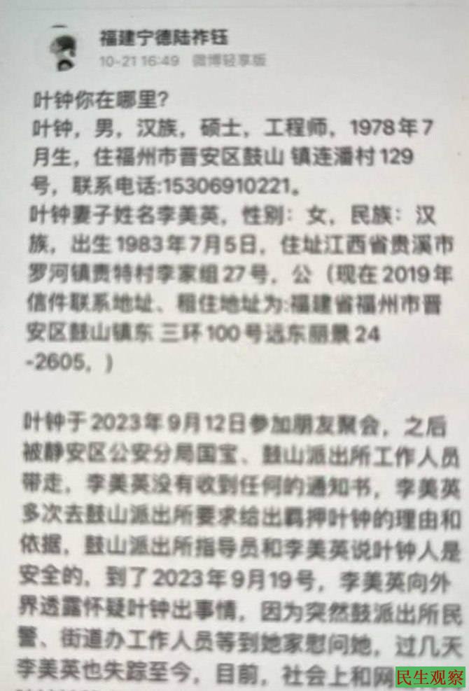 【民生观察2023年10月25日消息】2023年10月24日,是福建硕士访民叶钟死讯传出的第9天,其妻李美英仍失踪,当局继续封杀福州维权公民质疑声音。近日,福建屏南公民陆祚钰就叶钟死亡传言向福建12345平台投诉,被平台删除,将同样内容转发到微博上,竟被福州晋安区警方找上门逼删微博。