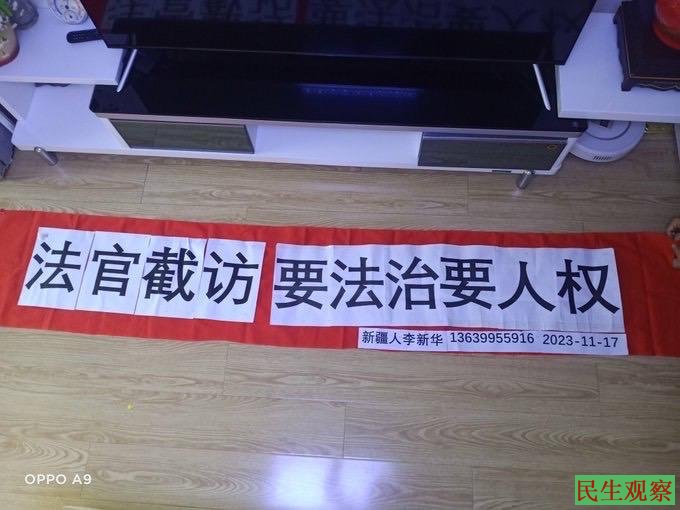 2023年11月17日,李新华再次在自家阳台上挂横幅维权。横幅内容为:法官截访,要法治要人权。新疆人:李新华13639955916,2023.11.17.