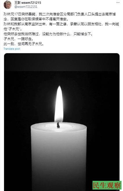 孙林兄17日突然暴毙,我两次向淮安区分局部门负责人口头提出去南京悼念,回复是你在取保候审中不得离开淮安。孙林和我都从南京监狱出来,有一面之缘,承蒙认同以朋友相处,我一向喊他“孑木兄”。他突然去世我当然难过,没能力为他做什么,只能悼念下。孑木兄,一路好走。此一别,世间再无孑木兄。