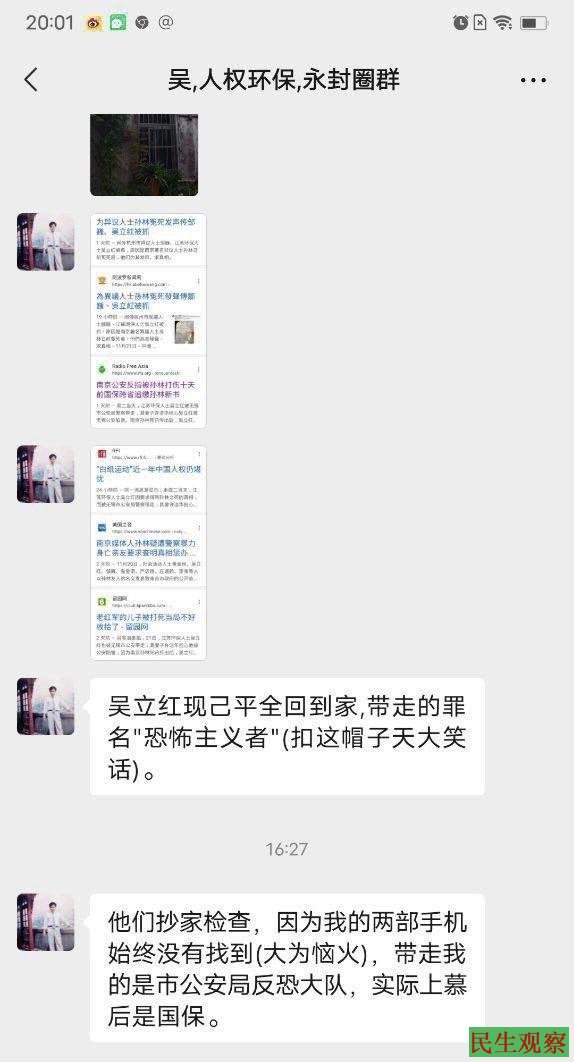 吴立红说,“我被带走的罪名是‘恐怖主义者’(扣这帽子天大笑话)。警方抄家检查,因为我的两部手机始终没有找到(大为恼火),带走我的是市公安局反恐大队,实际上慕后是无锡市公安局政保支队主导。”